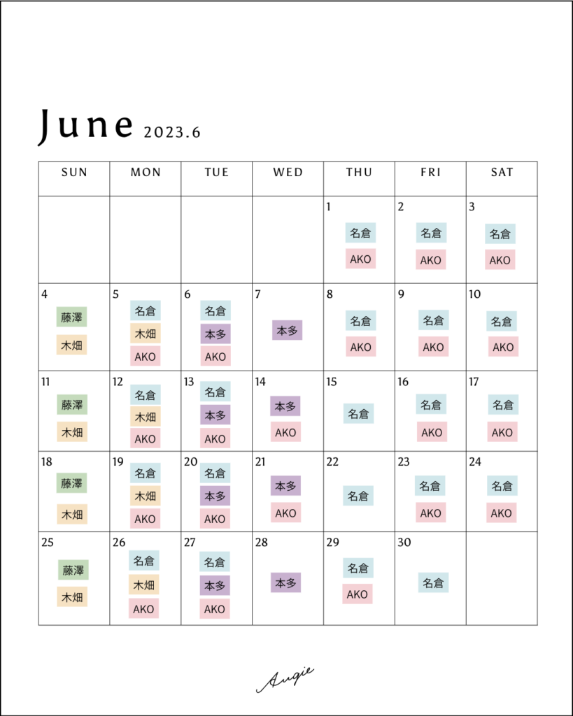 名倉院長、藤澤医師、木畑医師、本多医師、ナースAKOの出勤スケジュールをお知らせ致します。